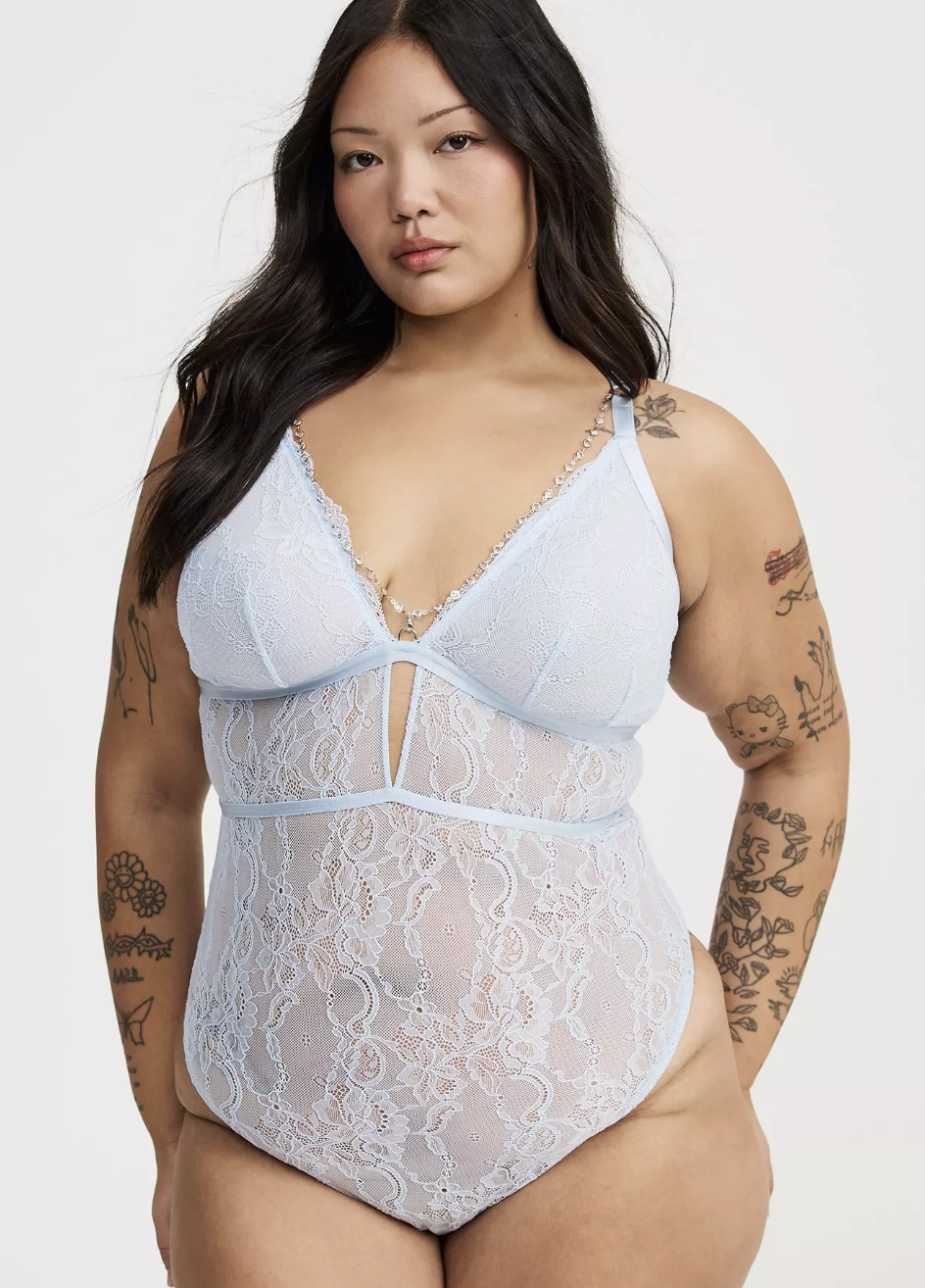 Bodysuits are such a staple in the lingerie world — they’re one of those pieces that truly can’t go wrong. They can be effortlessly casual or turn up the heat with barely-there details. This one is the perfect example: soft, comfortable lace paired with sheer panels and that little metal chain moment… it’s simple, sexy, and full of visual interest without trying too hard.