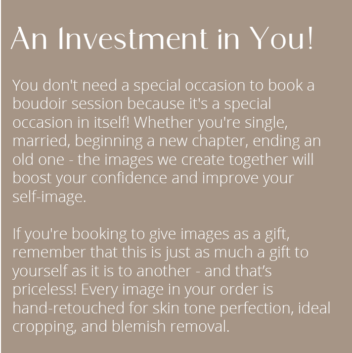 Time for 3-4 outfit changes is included in your session. I will teach you what works best for your body type and budget! Want to have more outfits added? More are available for $100/each.